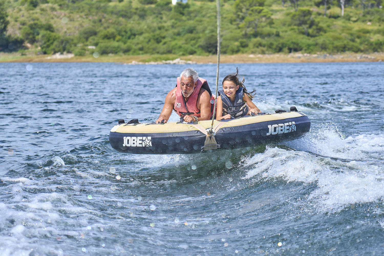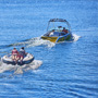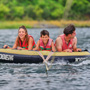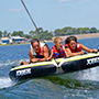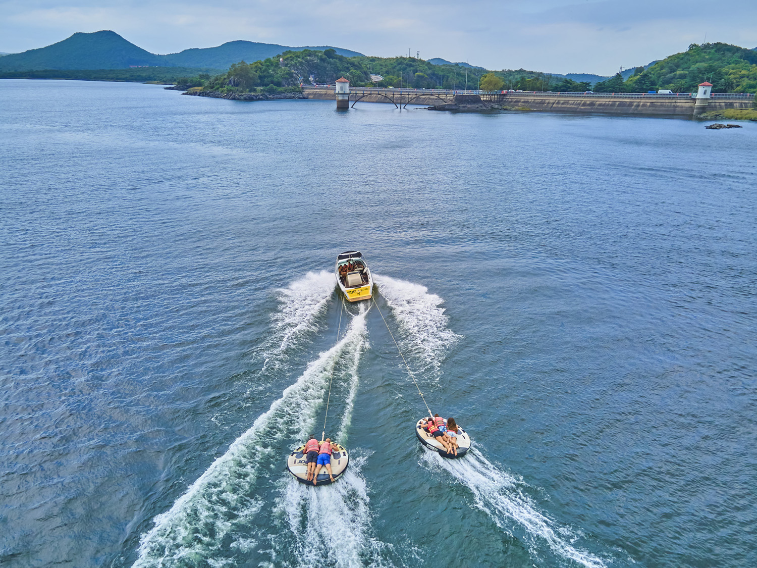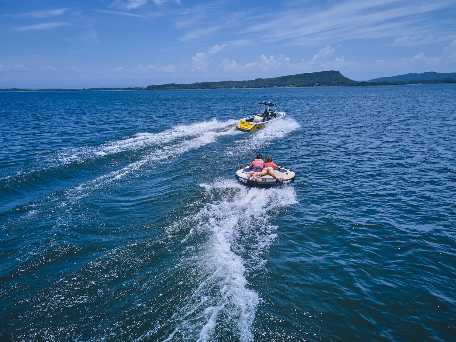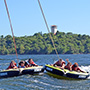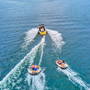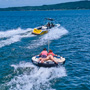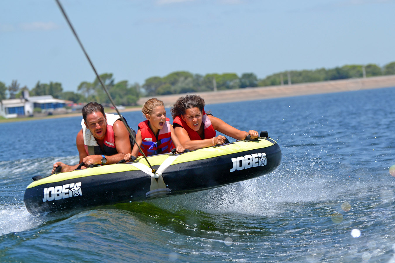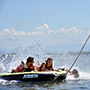 Es similar a la “banana” del mar, pero en versión disco, donde van acostados boca abajo, agarrados de manoplas, mientras la lancha los lleva durante 10 minutos de giros y velocidad.