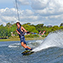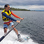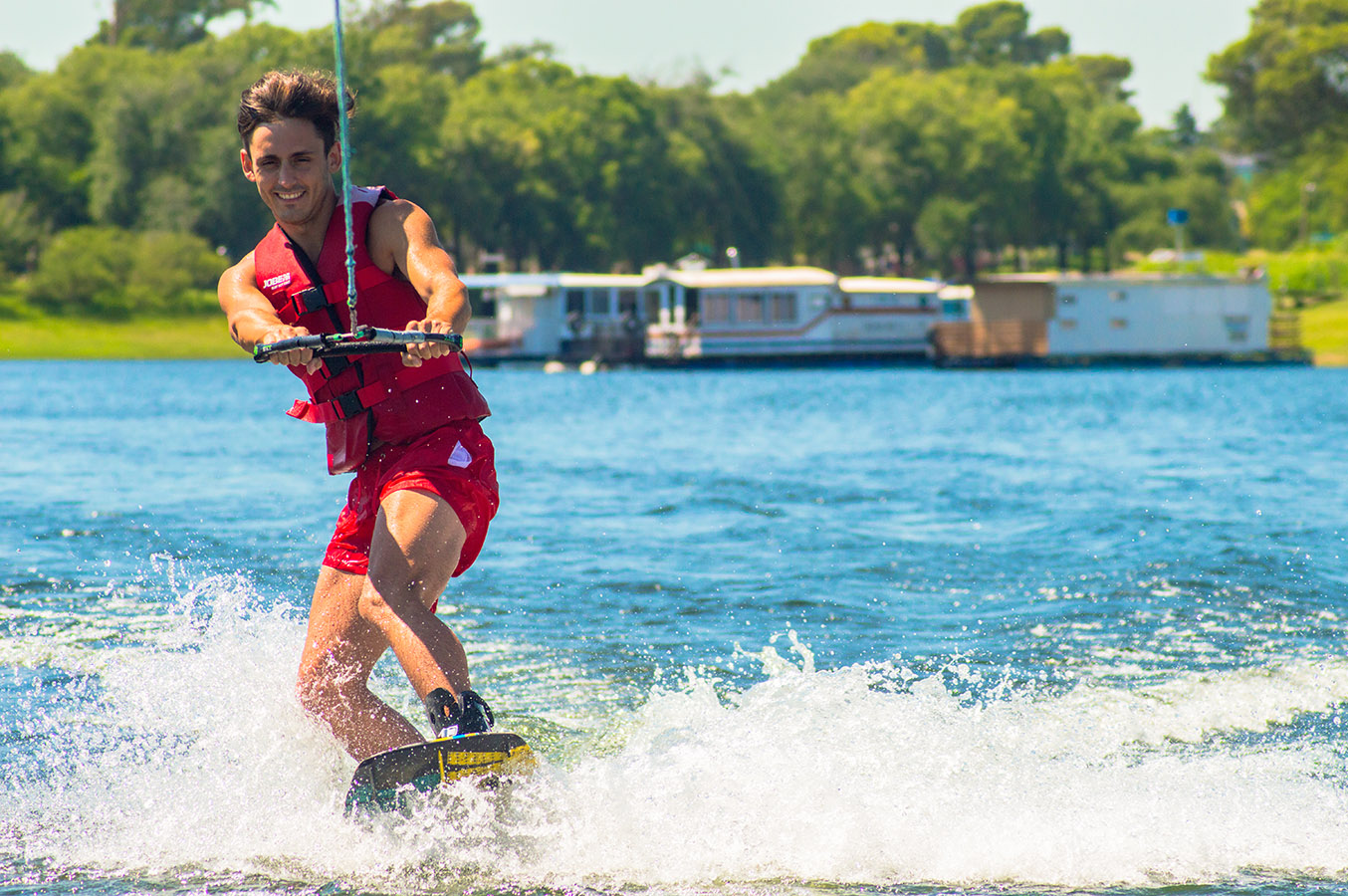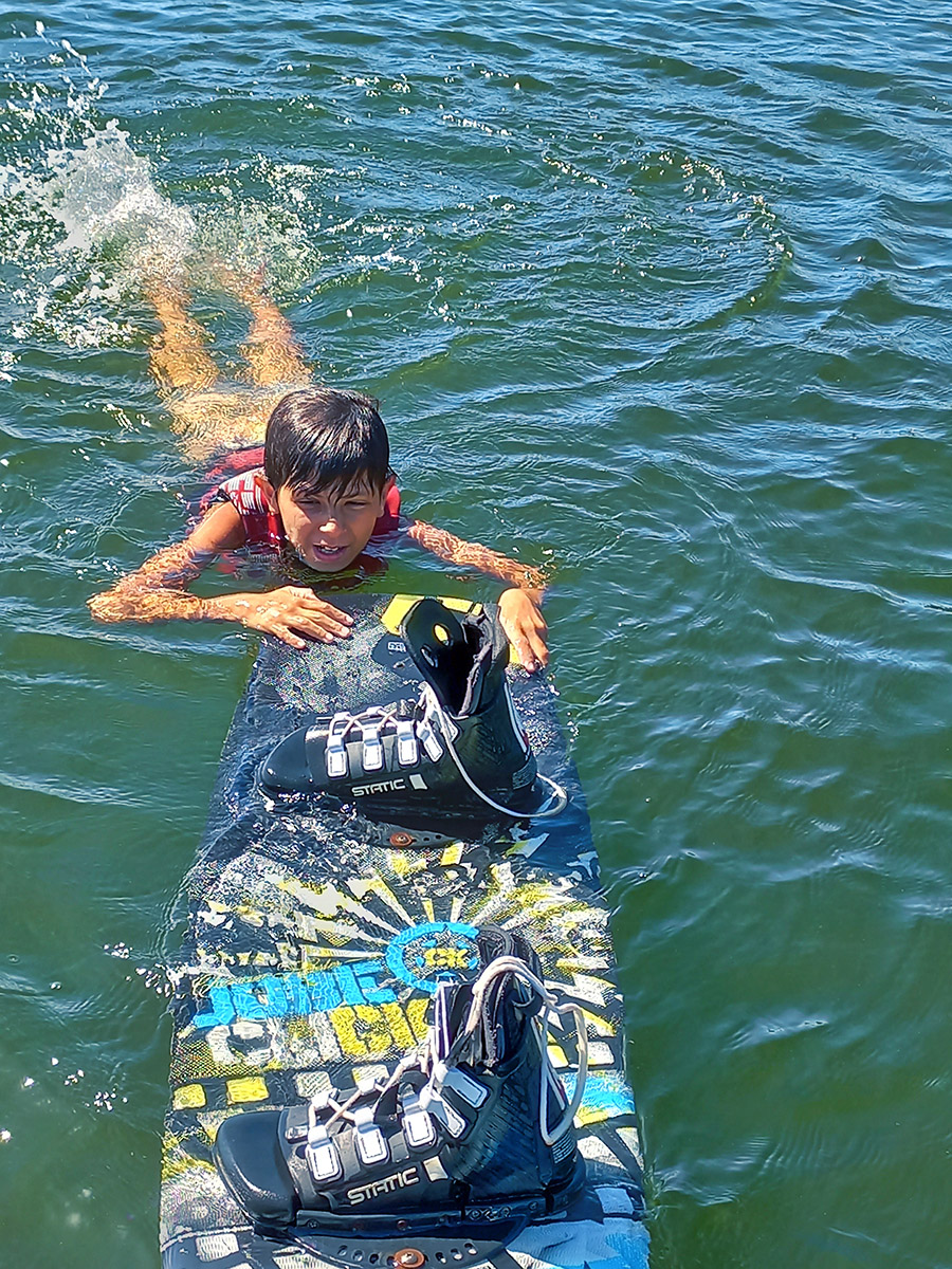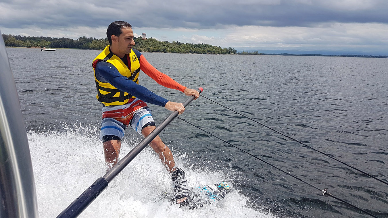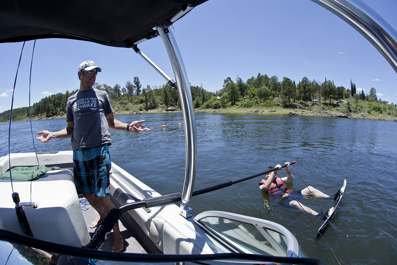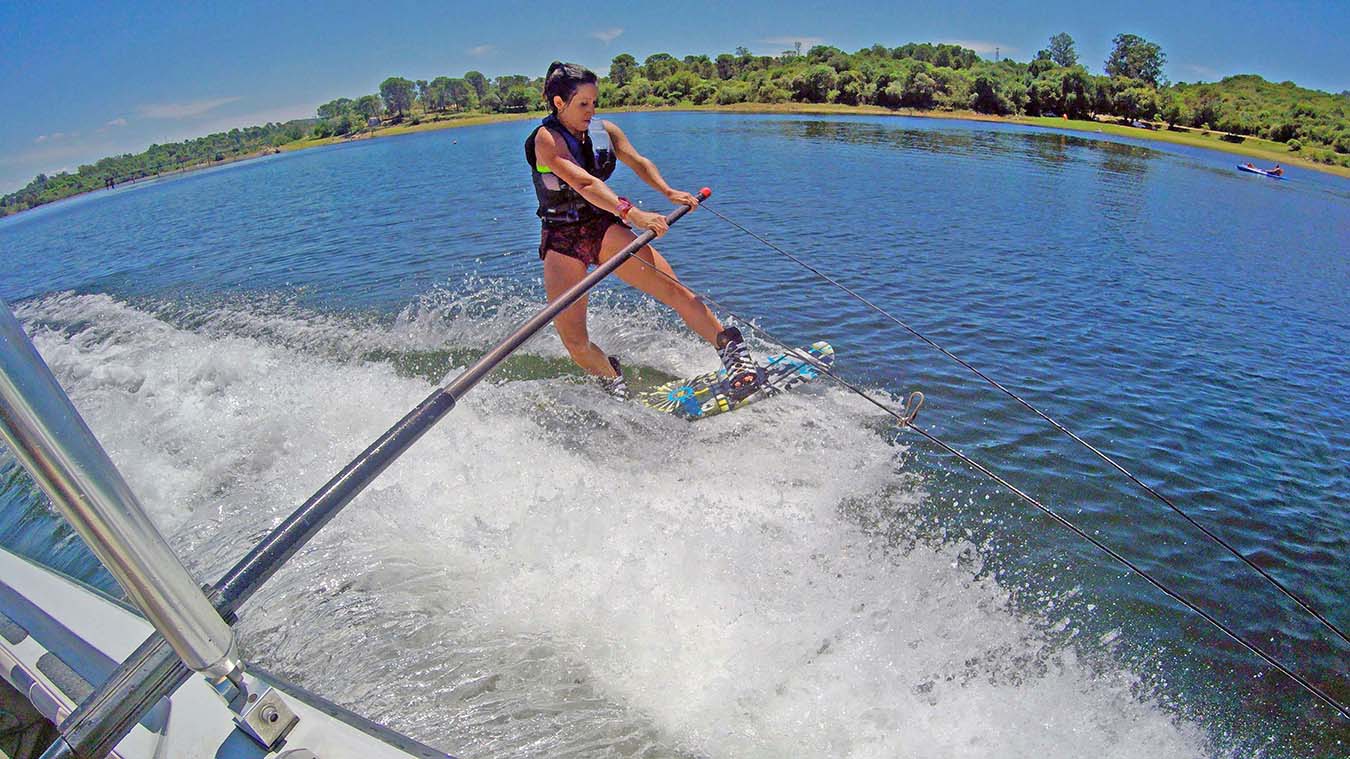 Si sos principiante, los primeros minutos se practican en una barra lateral para aprender la técnica de salida (sistema europeo) y después completás el tiempo esquiando detrás de la lancha con manillar.